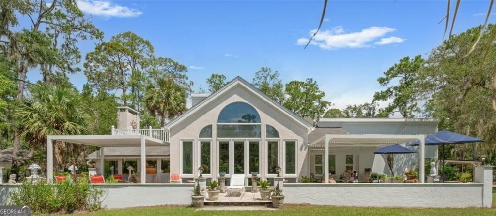 Elegant custom built home in the sought after Sea Palms golf community. This island classic contemporary features high vaulted ceilings in the sunroom and great room. Panoramic floor to ceiling south facing windows provide lots of sunlight and nature views. Open concept kitchen, great room, and sunroom with travertine flooring. Step down family room with vaulted tongue & groove stained ceiling, exposed beams and a brick fireplace. The stunning kitchen has a gorgeous cooktop island, granite countertops, stainless appliances, and double pantries. This home features two en-suites plus an additional guest bedroom with adjacent bath. The primary bedroom has a vaulted ceiling, private balcony and a his/her layout with separate dressing area and separate vanities and a skylight. This large, private lot is beautifully landscaped with topical plants and has room for a pool. AI generated pool in photos